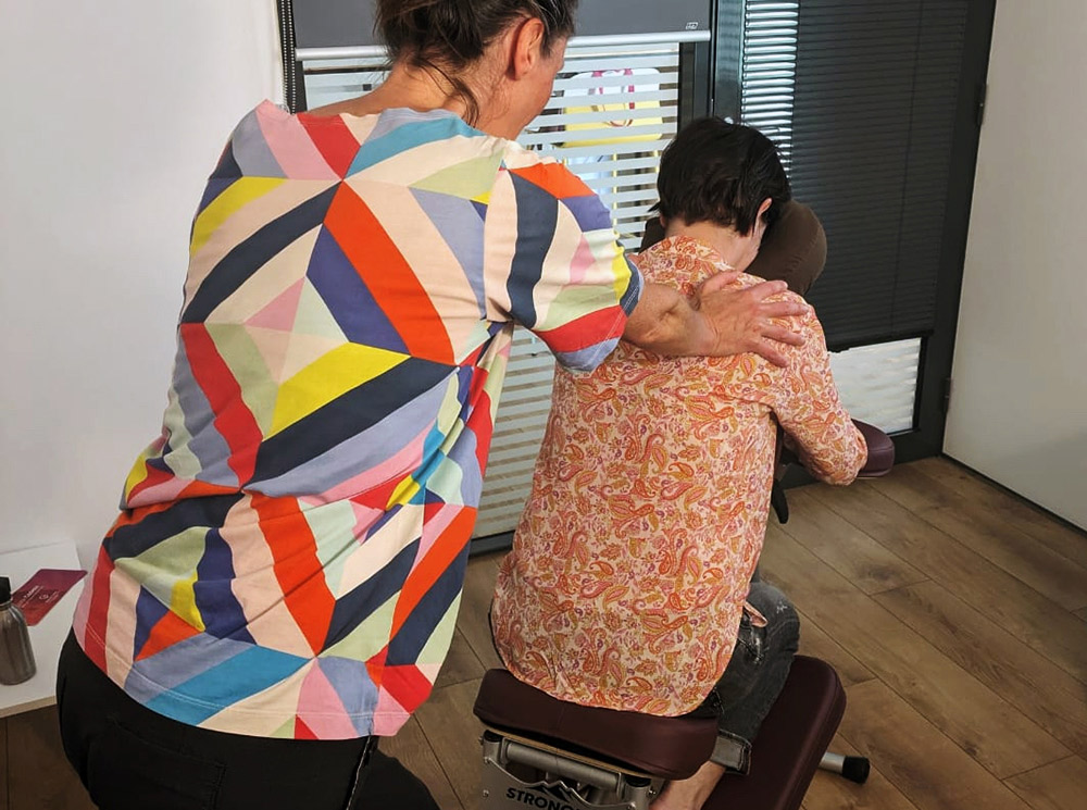 Le Massage Assis Minute® se pratique habillé, sur chaise ergonomique : dos, trapèzes, nuque, crâne, bras et mains.